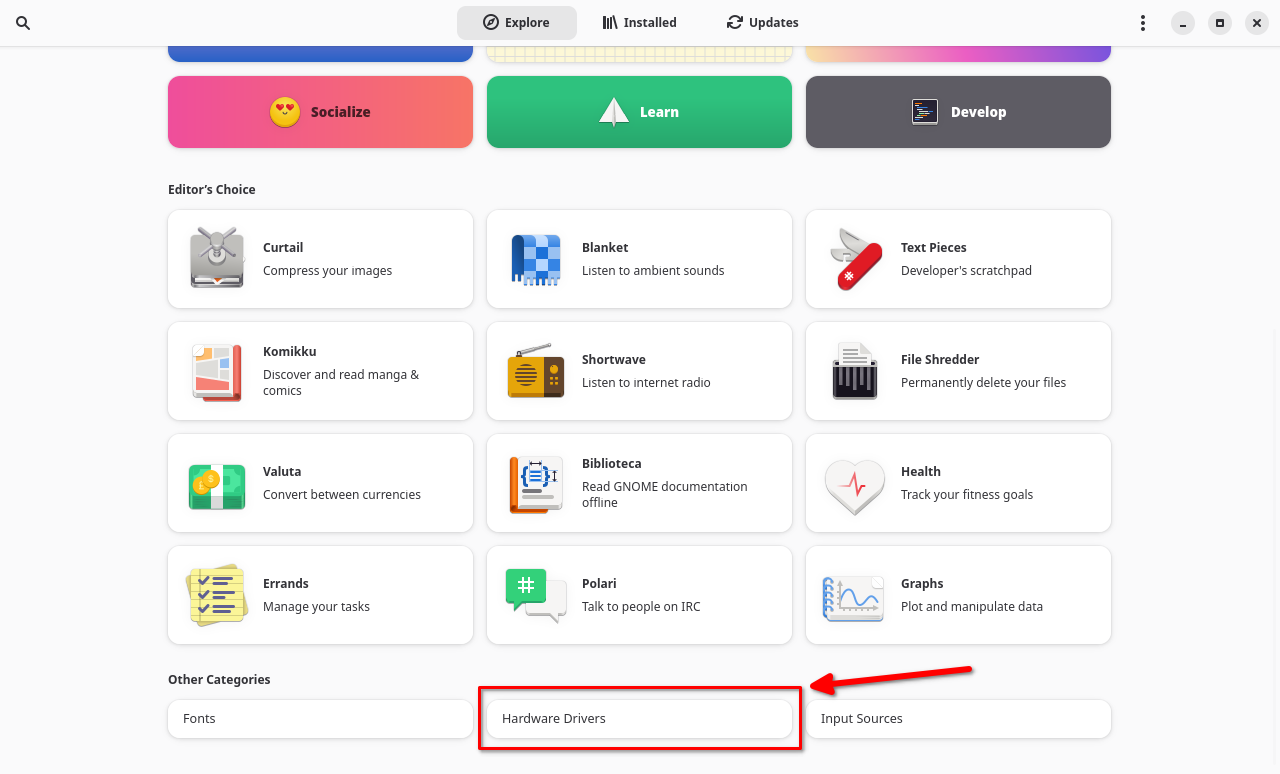 These can be found in the "Hardware" category in Discover and GNOME Software. What you see in this section will depend on your hardware and what's available for it. If you don't see a Hardware category, it's because there are no additional drivers available for your system.